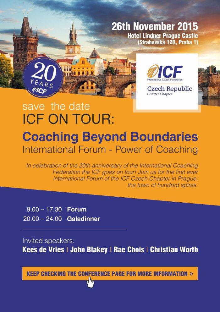 Szeretnénk felhívni a figyelmüket és meginvitálni az ICF Magyarország tagjait az ICF on Tour 2015 – Coaching beyond Boundaries elnevezésű nemzetközi fórumon való részvételre, mely a már karácsonyi pompába öltözött Prágában kerül megrendezésre 2015. november 26-án. Az inspiráló programot olyan neves és világhírű előadók garantálják mint Kees de Vries (2014 ICF President's Award Winner), John Blakey, Rae Chois és Christian Worth.