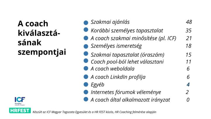 Az eredmények alapján elmondható, hogy a 1) szakmai ajánlás, 2) a korábbi  személyes tapasztalat, illetve 3) a coach szakmai minősítése lett a három legfontosabb  kritérium, amikor egy vezető coachot ajánl másnak, vagy választ magának. A coach  weboldala, LinkedIn profilja, vagy az internetes fórumokon megjelenő információk szintén  fontosak, de maximum megerősíteni tudják azt, hogy rájuk essen a választás.