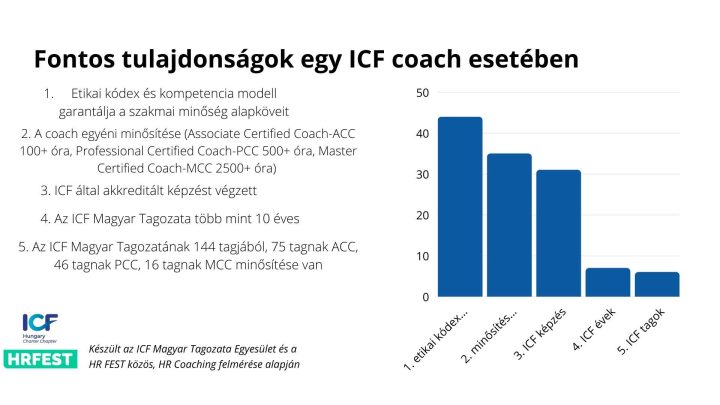 A számokat tekintve elmondható, hogy egy olyan coachnál, aki ICF tag, a legfontosabb  szempont az etikai kódex és a kompetenciamodell, a második helyen a coach egyéni  minősítése szerepel, a harmadik helyen pedig az ICF által akkreditált képzés elvégzése. Az  utolsó két válaszlehetőséget valószínűleg csak tudomásul vették a kitöltők, de a számok azt  mutatják, hogy az első három szempont sokkal fontosabb ezeknél.