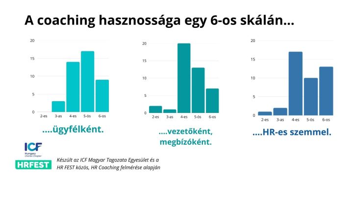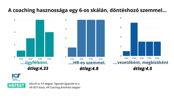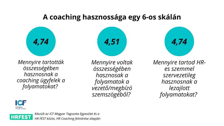A coaching folyamat hasznosságát mindhárom kérdés esetében egy egytől hatig  terjedő skálán értékelhették a kitöltők. Általánosságban elmondható, hogy a vezetők nem vitatják a coaching hasznosságát, viszont a számok azt tükrözik, hogy az egyes  szervezeteknél lezajlott folyamatok hasznosságát lehetne még erősíteni.